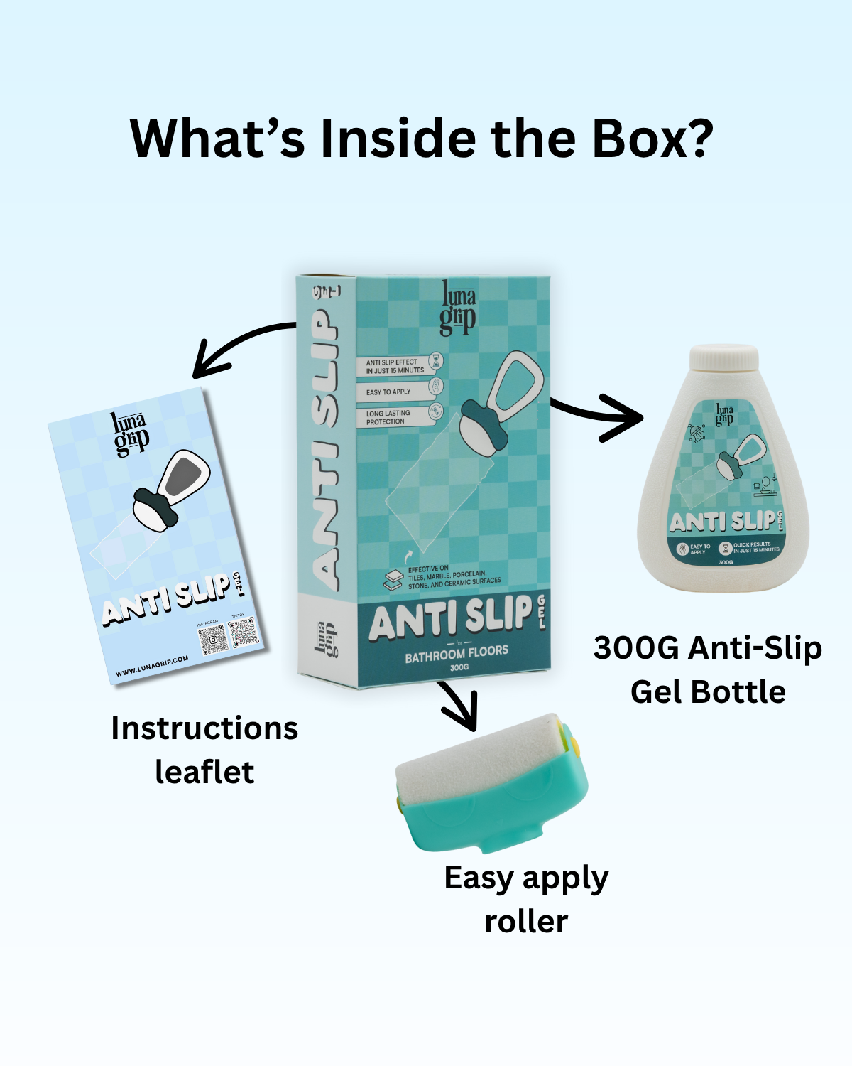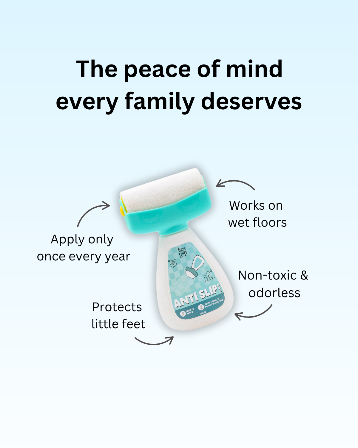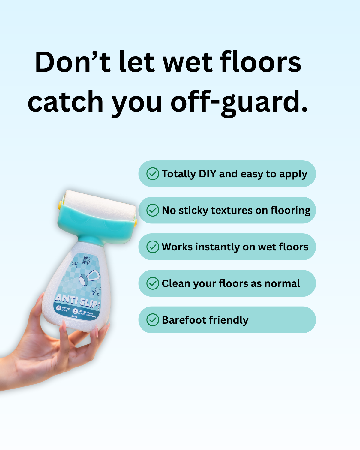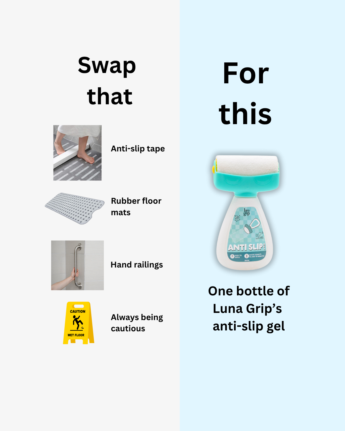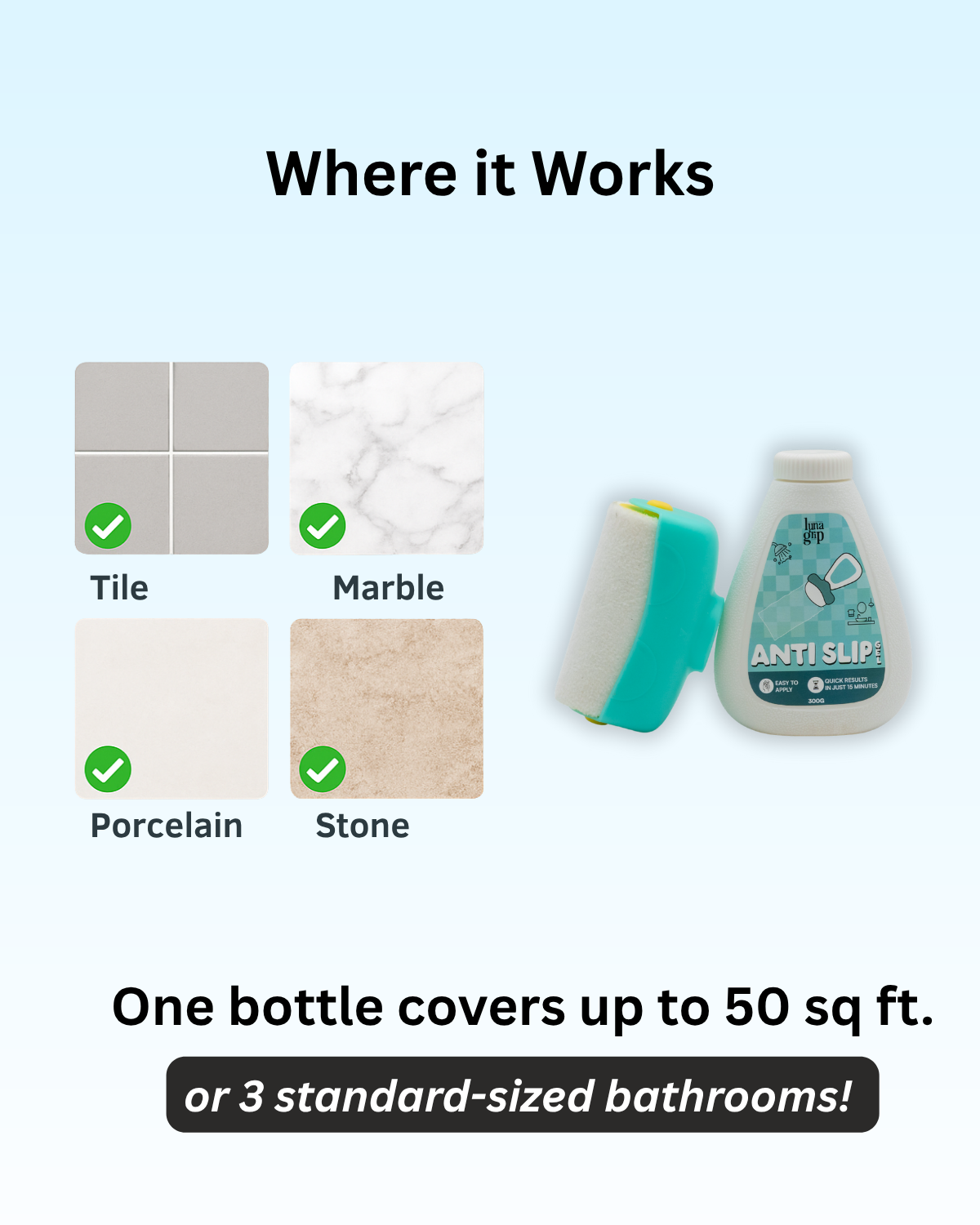 Did you know that up to 80% of falls in the home occur in the bathroom? Spilled soaps, shampoos, and water make bathrooms one of the most dangerous areas in your home. Luna Grip’s Anti-Slip Gel for Bathroom Floors enhances traction on tiles, marble, and ceramic surfaces, keeping you safe from slips and falls in the shower or on wet bathroom floors.